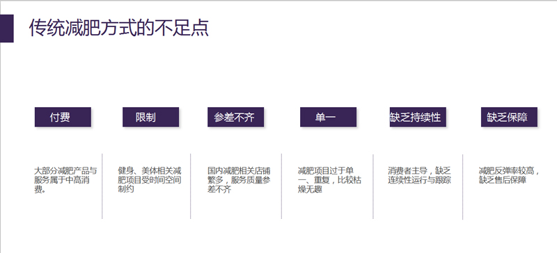 相對傳統的減肥市場上多以健身房和減肥藥為主,健身房與減肥藥的局限性明顯。健身房受時間、空間制約,私教費用高,并且缺乏持續性;減肥藥不僅影響身體健康而且反彈率較高,缺乏售后保障。